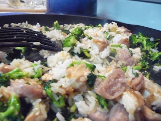 Okay, so I started with two tablespoons of olive oil and a slice of butter in the skillet as I dropped the garlic in on low. I added the chicken, because it came out of the fridge and was cold. Then the sausage. Then the broccoli. Every time the liquid got absorbed, I pushed everything to one side of the skillet (now at medium heat) and added a couple tablespoons of butter and equal amounts of lemon juice and blended them vigorously. Then I let the sauce seep to the other side of the pan and mixed everything up again.